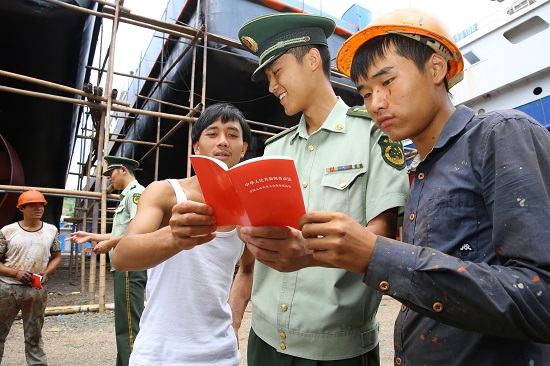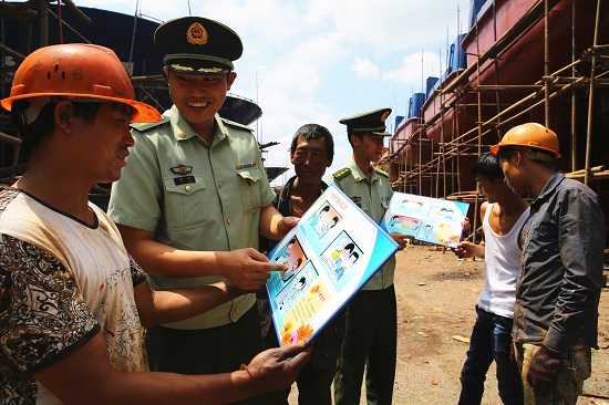 圖為,8月25日,桐照邊防官兵為轄區(qū)工地建筑工宣傳法律知識(shí)。(吳慧華)