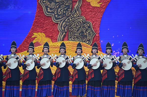 10月28日,來自廣西壯族自治區(qū)的演員在開幕式上表演節(jié)目《阿妹的繡球》。