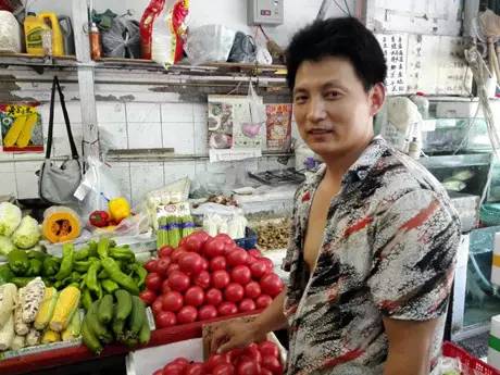 黝黑的膚色、鮮亮的穿著,沈大哥在不大的攤位里輾轉(zhuǎn)騰挪、十分自如。他的攤位在市場(chǎng)門口,雖然看上去有些簡(jiǎn)陋,但蔬菜都十分鮮亮誘人。