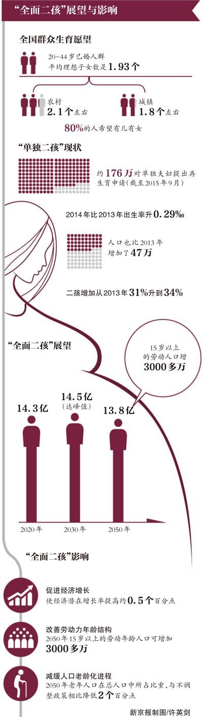 國家衛(wèi)計委:新增可生二孩的人里40到49歲占一半,國家衛(wèi)生計生委副主任王培安表示,據預測,實施全面二孩政策,到2050年可增加3000多萬勞動力,勞動力年齡結構有所改善;到2050年老年人口在總人口中所占比重,與不調整政策相比降低2個百分點,將在一定程度上減緩人口老齡化進程 優(yōu)勢。