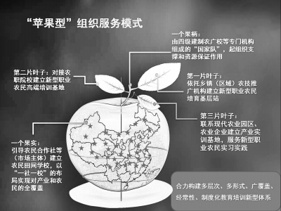 農(nóng)民教育培訓(xùn)最大的問題是組織問題,創(chuàng)新農(nóng)民教育培訓(xùn)模式,首先要創(chuàng)新農(nóng)民教育培訓(xùn)組織方式,有效破解教育培訓(xùn)“低水平簡單重復(fù)”和“搞培訓(xùn)不抓隊伍”問題。農(nóng)廣校堅持開放的大體系觀,創(chuàng)新機制模式打造資源集合平臺,推進專門機構(gòu)、相關(guān)資源和市場主體三種力量結(jié)盟,探索建立政府部門統(tǒng)籌領(lǐng)導(dǎo)下的新型職業(yè)農(nóng)民教育培訓(xùn)“蘋果型”組織服務(wù)方式。“一個果柄”是作為“國家隊”的專門機構(gòu)。由中央、省、市、縣四級建制農(nóng)廣校組成,起組織支撐和資源保證作用!叭~子”是相關(guān)資源的有序高效利用。“第一片葉子”是依托鄉(xiāng)鎮(zhèn)(區(qū)域)農(nóng)技推廣機構(gòu)建立新型職業(yè)農(nóng)民培育基層站,將專門機構(gòu)的組織支撐和資源保證作用進一步向鄉(xiāng)鎮(zhèn)(區(qū)域)延伸;“第二片葉子”是對接農(nóng)職院校建立培養(yǎng)基地,提供新型職業(yè)農(nóng)民高端培訓(xùn)和高職教育;“第三片葉子”是聯(lián)系現(xiàn)代農(nóng)業(yè)園區(qū)、農(nóng)業(yè)企業(yè)建立產(chǎn)業(yè)實訓(xùn)基地,服務(wù)新型職業(yè)農(nóng)民實習(xí)實踐。“一個果實”是作為市場主體的新型農(nóng)業(yè)經(jīng)營主體。引導(dǎo)農(nóng)民合作社等建立農(nóng)民田間學(xué)校,以“一社一校”的布局實現(xiàn)對產(chǎn)業(yè)和農(nóng)民的全覆蓋!疤O果型”有機統(tǒng)一體,把政府部門的統(tǒng)籌主導(dǎo)職能、專門機構(gòu)的支撐保證作用、相關(guān)資源的有序高效利用機制導(dǎo)入市場主體,共同培育和服務(wù)新型職業(yè)農(nóng)民。