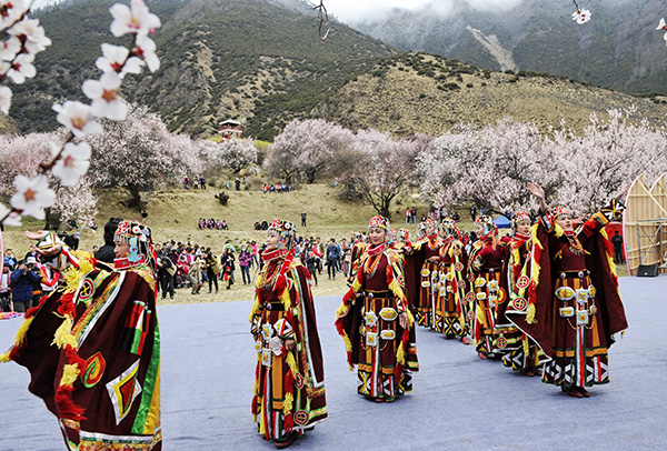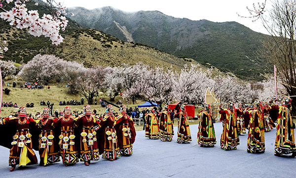 3月22日,在西藏林芝市巴宜區(qū)八一鎮(zhèn)嘎拉村,演員在桃花林小廣場(chǎng)上為游客表演。