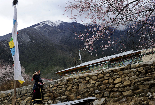 3月22日,在西藏林芝市巴宜區(qū)八一鎮(zhèn)公眾村,一名女孩在一個(gè)農(nóng)家小院外觀賞桃花。