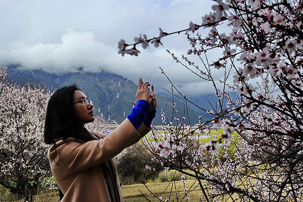 3月22日,游客在西藏林芝市巴宜區(qū)八一鎮(zhèn)嘎拉村欣賞桃花。