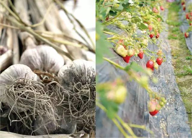 草莓以高壟種植、四膜覆蓋。草莓于8月下旬種植后,在莖中間滴灌管旁每50-60厘米栽大蒜1株。大蒜通過低溫催芽。10月初草莓開始覆蓋地膜時,將草莓、大蒜一起掏出膜外。
