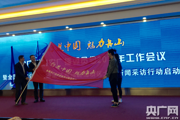 中廣聯(lián)對農(nóng)廣播委員會會長史敏、舟山市委常委、宣傳部部長、統(tǒng)戰(zhàn)部部長忻海平為“行進(jìn)中國·魅力舟山”全國農(nóng)村廣播記者走進(jìn)舟山大型新聞采訪行動授旗。中央人民廣播電臺中國鄉(xiāng)村之聲記者劉旻嚖、舟山新聞廣播記者沈宇曄接旗。
