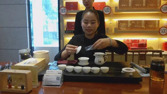 林幼虹:第一步,白鶴沐浴,就是溫杯,用開水把所有的杯子都溫一遍,第二道,烏龍入宮,把茶葉導(dǎo)進(jìn)去;第三個(gè)是懸露高沖,從高處把開水倒進(jìn)去;第四個(gè)就是清風(fēng)拂面,刮沫;第五個(gè),就是翔龍行雨,把茶水倒出來(lái);第六個(gè)是鳳凰點(diǎn)頭,就是分茶;第七,賞色聞香,聞一下氣味,看一下清澈度;第八就是品醉甘露,就是品茶。