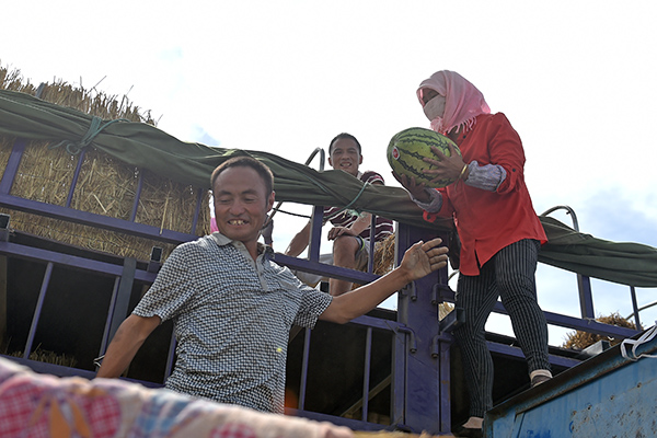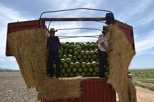 7月23日,寧夏中衛(wèi)市香山鄉(xiāng)瓜農(nóng)將硒砂瓜裝車。