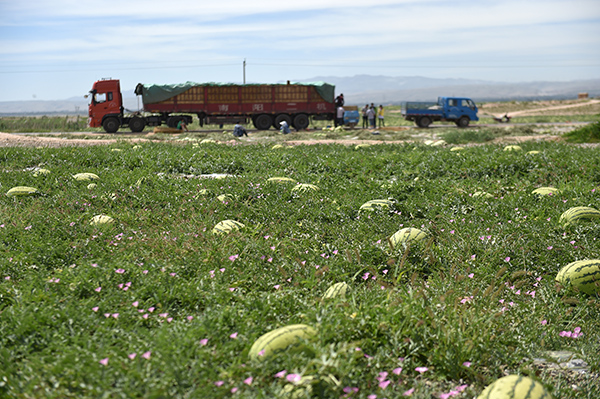 7月23日,前來收購硒砂瓜的大車停靠在寧夏中衛(wèi)市香山鄉(xiāng)瓜田旁。