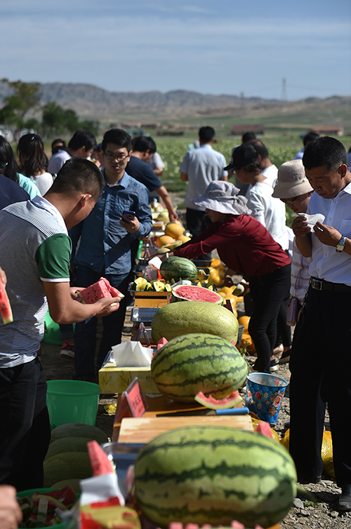 7月23日,來自全國各地的客商在寧夏中衛(wèi)市興仁鎮(zhèn)品嘗硒砂瓜。