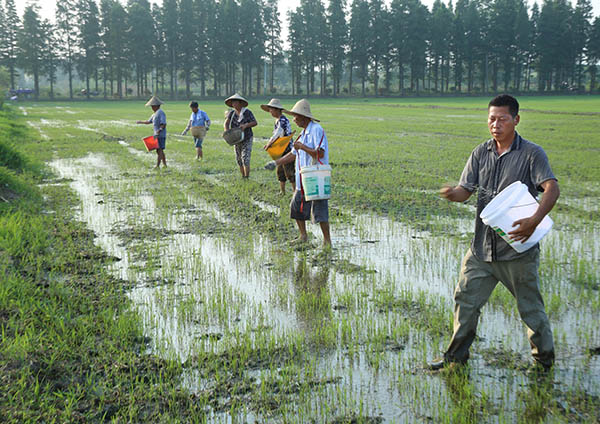 7月27日,江蘇宜興市徐舍鎮(zhèn)佘圩村種田大戶范國良(右一)組織農(nóng)民對補種的300多畝水稻施肥。