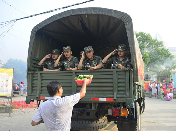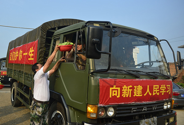 7月31日,當?shù)厝罕娤螂x開的部隊戰(zhàn)士們送蓮蓬等食品。