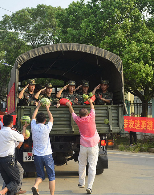 7月31日,當?shù)厝罕娤螂x開的部隊戰(zhàn)士們送瓜果、蓮蓬等食品。