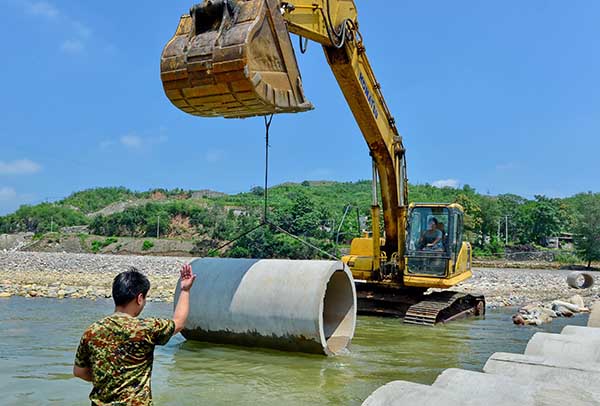 8月2日,河北邢臺(tái)縣將軍墓鎮(zhèn)黨員突擊隊(duì)員利用大型機(jī)械在南野河上架橋。