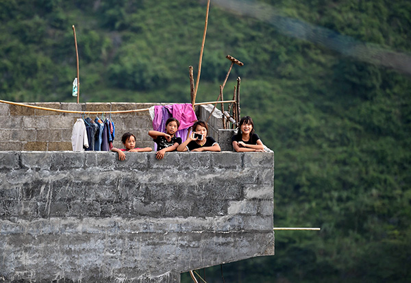 在廣西大化七百弄鄉(xiāng)弄騰村,從山里搬遷至公路邊的女孩在新房樓頂看風景(8月7日攝)。