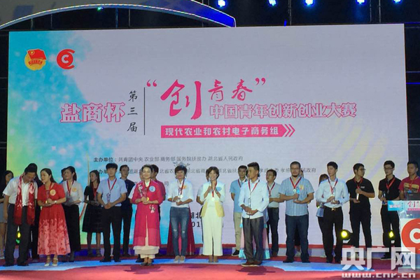 央廣網(wǎng)北京9月7日消息(記者何鵬)據(jù)中國鄉(xiāng)村之聲報(bào)道,9月7日上午,“鹽商杯”第三屆“創(chuàng)青春”中國青年創(chuàng)新創(chuàng)業(yè)大賽(現(xiàn)代農(nóng)業(yè)和農(nóng)村電子商務(wù)組)全國賽在湖北省孝感市閉幕。團(tuán)中央書記處書記徐曉觀摩決賽并為獲獎(jiǎng)選手頒獎(jiǎng)。農(nóng)業(yè)部、商務(wù)部、國務(wù)院扶貧辦、湖北省人民政府等主辦單位相關(guān)負(fù)責(zé)同志,冠名贊助單位及各承辦單位、支持單位代表出席活動(dòng)。20余家創(chuàng)業(yè)投資機(jī)構(gòu)負(fù)責(zé)人、入圍決賽的30強(qiáng)參賽項(xiàng)目負(fù)責(zé)人及創(chuàng)業(yè)青年代表等1500余人,參加全國賽決賽暨頒獎(jiǎng)儀式。
