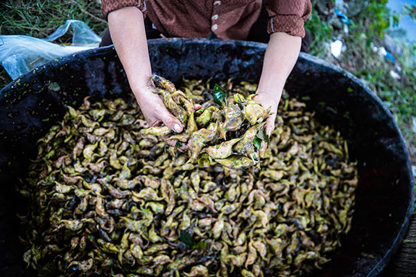 10月9日,東林鎮(zhèn)的農(nóng)民在整理剛采摘上來的菱角。