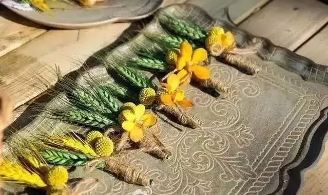 新郎的胸花是金黃麥穗,伴郎胸花是綠色麥穗。