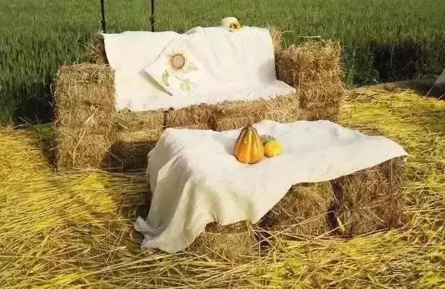 草垛擺成了沙發(fā)、茶幾,茶幾上擺幾只小南瓜,喜慶。