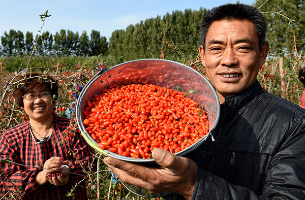 11月1日,石世杰(右)、石宗敬夫婦展示自家農(nóng)場采摘的低糖枸杞。