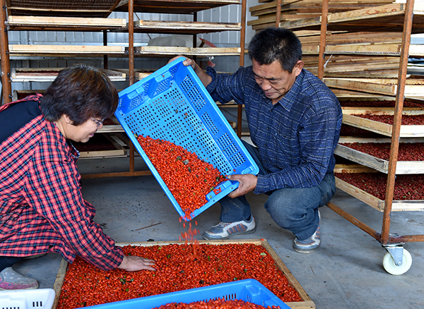 11月1日,石世杰(右)、石宗敬夫婦準(zhǔn)備將剛采摘的低糖枸杞進(jìn)行烘干。