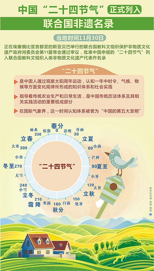 在埃塞俄比亞首都亞的斯亞貝巴舉行的聯(lián)合國教科文組織保護非物質(zhì)文化遺產(chǎn)政府間委員會第11屆常會11月30日通過審議,批準中國申報的“二十四節(jié)氣”列入聯(lián)合國教科文組織人類非物質(zhì)文化遺產(chǎn)代表作名錄。