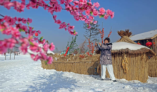 1月3日,一名游客在錦州東方華地城冰雪大世界的東北民俗小屋前拍照。