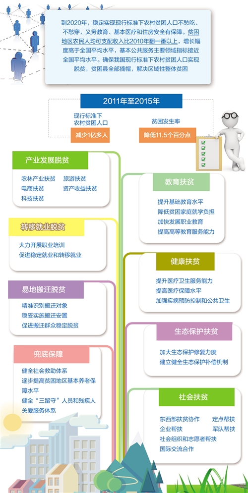 《規(guī)劃》明確提出,到2020年,穩(wěn)定實現(xiàn)農(nóng)村貧困人口不愁吃、不愁穿,義務教育、基本醫(yī)療和住房安全有保障;貧困地區(qū)農(nóng)民人均可支配收入增長幅度高于全國平均水平,基本公共服務主要領域指標接近全國平均水平;確保我國現(xiàn)行標準下農(nóng)村貧困人口實現(xiàn)脫貧,貧困縣全部摘帽,解決區(qū)域性整體貧困。