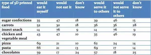 結(jié)果表明,人們更愿意嘗試一些偏傳統(tǒng)的食物,如3D打印的巧克力、披薩、意面。在自己是否愿意食用這一選項(xiàng)上,3D胡蘿卜、巧克力、披薩、意面得分超過了50%;3D糖果、昆蟲、雞肉、蔬菜的得分不足50%。