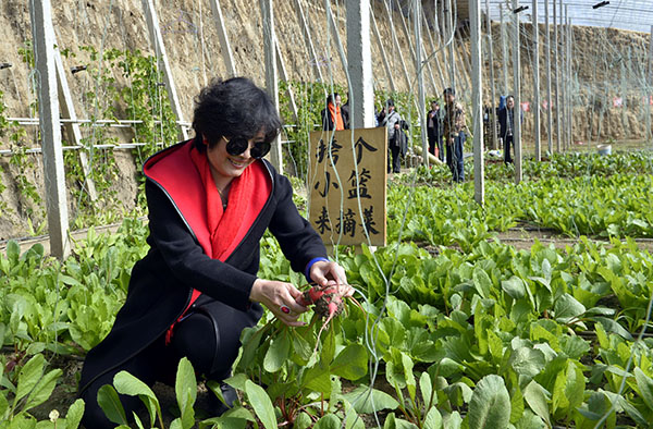 2月11日,一名游客在雨順種植農(nóng)民專業(yè)合作社的溫室大棚內(nèi)體驗收獲新鮮蔬菜。