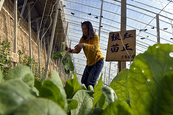 2月11日,一名在合作社“認(rèn)養(yǎng)”菜地的市民在雨順種植農(nóng)民專業(yè)合作社的溫室大棚內(nèi)收獲新鮮蔬菜。