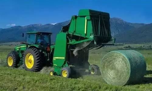 △牧草打捆,在收割機(jī)上甩幾下臂膀就把活干好了。(德國(guó))