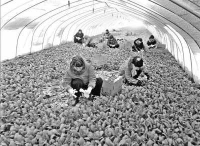 在江蘇省沭陽縣錢集鎮(zhèn)大南村農(nóng)家樂定點采購的蔬菜基地,工人們正在采摘蔬菜!《∪A明攝