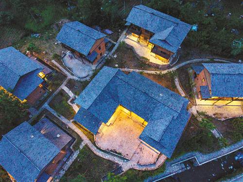 一條小溪,潺潺地從村子一旁淌過。隨著日頭升起,云霧逐漸散去,一幢幢別致的農(nóng)家小樓房漸漸顯現(xiàn)出來,一座座形態(tài)各異、仿佛拔地而起的山峰蒼翠欲滴。