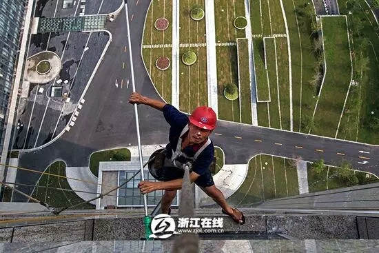 “蜘蛛人”本就是一種十分危險的職業(yè),為了養(yǎng)家糊口,他們不得不忍受著高溫持續(xù)工作。熱的時候就用清洗大樓的水管里的水往自己身上澆。最讓他們難受的是,明明氣溫40多度,可自己懸在半空中還直冒冷汗,渾身發(fā)軟,就如同下地獄一般。圖為在杭州某寫字樓外工作的“蜘蛛人”。