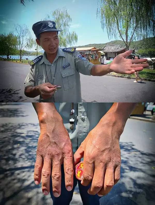 在很多地方我們都能見到保安,他們每天都要巡邏自己工作的地方。對于在公園中工作的保安而言,酷熱和暴曬是他們所要面對的最大問題。被譽為杭州“最美”保安的老于在保安的崗位上已經(jīng)工作五年了,他的皮膚早已被曬得通紅,雙手更是被曬出泡,像雞皮疙瘩一樣密密麻麻。