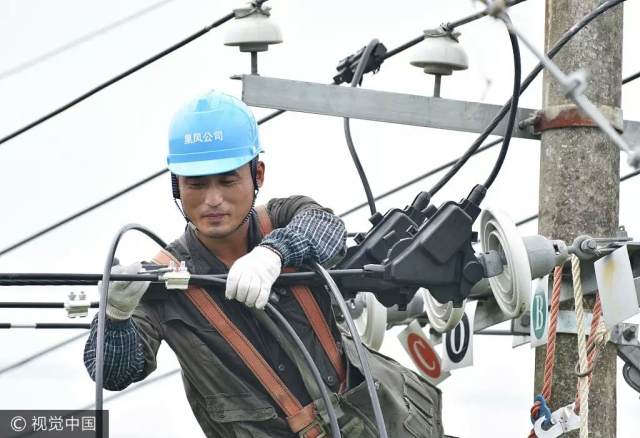 圖為2017年7月12日,安徽巢湖,供電員工冒著高溫天氣在對10千伏線路進行架設。
