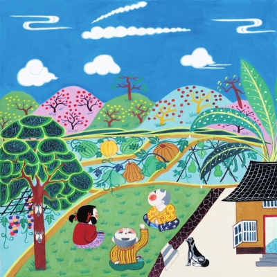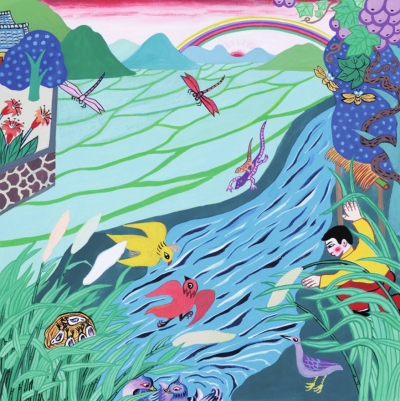 解氏兄弟的畫作,秉承永豐農(nóng)民畫的特點,畫中景物多運用抽象、夸張的藝術(shù)處理手法,以大色塊構(gòu)成畫面主體,顏色對比強烈、色調(diào)絢麗飽滿;構(gòu)圖上吸納民間剪紙、傳統(tǒng)壁畫的表現(xiàn)形式,既有強烈的地方性、傳統(tǒng)的“土氣”,又有鮮明的時代精神、現(xiàn)代的“洋氣”;人物表現(xiàn)則質(zhì)樸憨拙,兼顧美感和力度,以外形揭示人物內(nèi)在純樸天真的性格,極富表現(xiàn)力與裝飾效果。