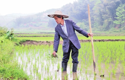 ⑤解振輝在打理糧田。