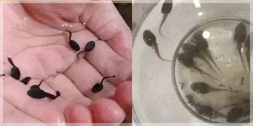 體色較淺、身體略圓、尾巴長的是青蛙的蝌蚪。身體黑帶紫、體形橢圓、尾巴短的則是蟾蜍的蝌蚪。