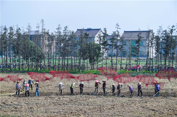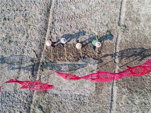 10月26日,村民在翻耕土地,為播種油菜做準備。紅色的金屬魚也是當(dāng)?shù)赜^光帶的特色景觀。