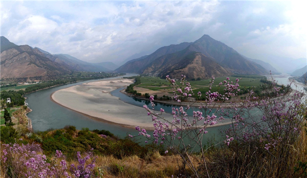 這是云南省麗江市石鼓鎮(zhèn)鮮花和綠樹掩映下的“長江第一灣”(2016年3月29日攝)。新華社記者 藺以光 攝