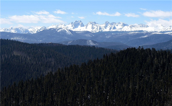 這是云南省迪慶藏族自治州香格里拉市境內(nèi)的森林和雪山一景(3月24日攝)。新華社記者 藺以光 攝