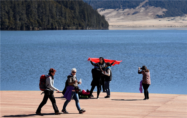 中外游客在云南省迪慶藏族自治州普達措國家公園里游覽(3月24日攝)。新華社記者 藺以光 攝