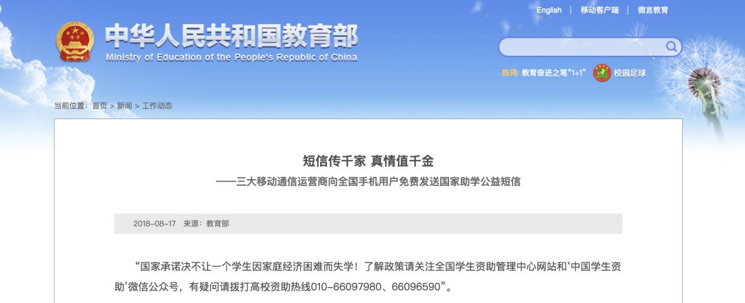 據(jù)教育部介紹,公益短信的內(nèi)容為:國(guó)家承諾決不讓一個(gè)學(xué)生因家庭經(jīng)濟(jì)困難而失學(xué)!了解政策請(qǐng)關(guān)注全國(guó)學(xué)生資助管理中心網(wǎng)站和“中國(guó)學(xué)生資助”微信公眾號(hào),有疑問(wèn)請(qǐng)撥打高校資助熱線010-66097980、66096590。
