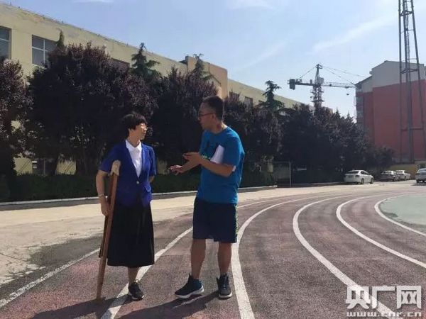 在樓道里,主播和王平老師邊走邊聊。她說(shuō),6歲的時(shí)候,一場(chǎng)車禍讓她失去了右腿。在周圍人的幫助下,她堅(jiān)強(qiáng)地站了起來(lái)。長(zhǎng)大以后,她心存感恩,成為了澤州縣水東中學(xué)的一名語(yǔ)文老師。