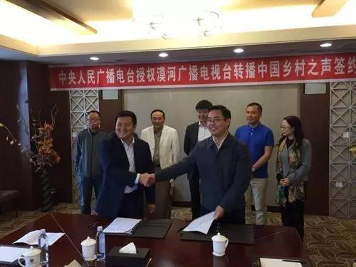▲ 中央人民廣播電臺社教中心主任劉智力與漠河縣廣播電視臺臺長邵洪志簽署轉(zhuǎn)播協(xié)議。