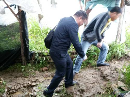 ▲ 河南農(nóng)業(yè)大學(xué)生命科學(xué)院教授、國家食用菌產(chǎn)業(yè)技術(shù)體系崗位科學(xué)家申進(jìn)文冒雨在林場指導(dǎo)。