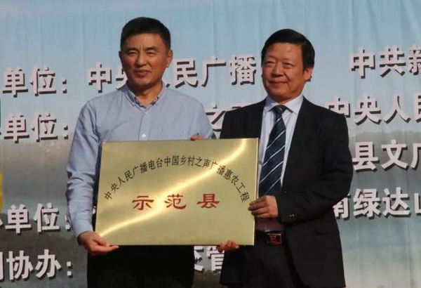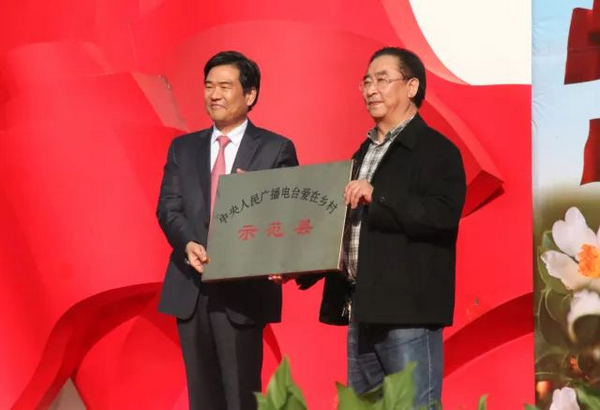 中央人民廣播電臺為新縣授予“中央人民廣播電臺中國鄉(xiāng)村之聲廣播惠農(nóng)工程示范縣”牌匾,中央人民廣播電臺社教節(jié)目中心副主任陶煒授牌,新縣縣委副書記林志成接牌。