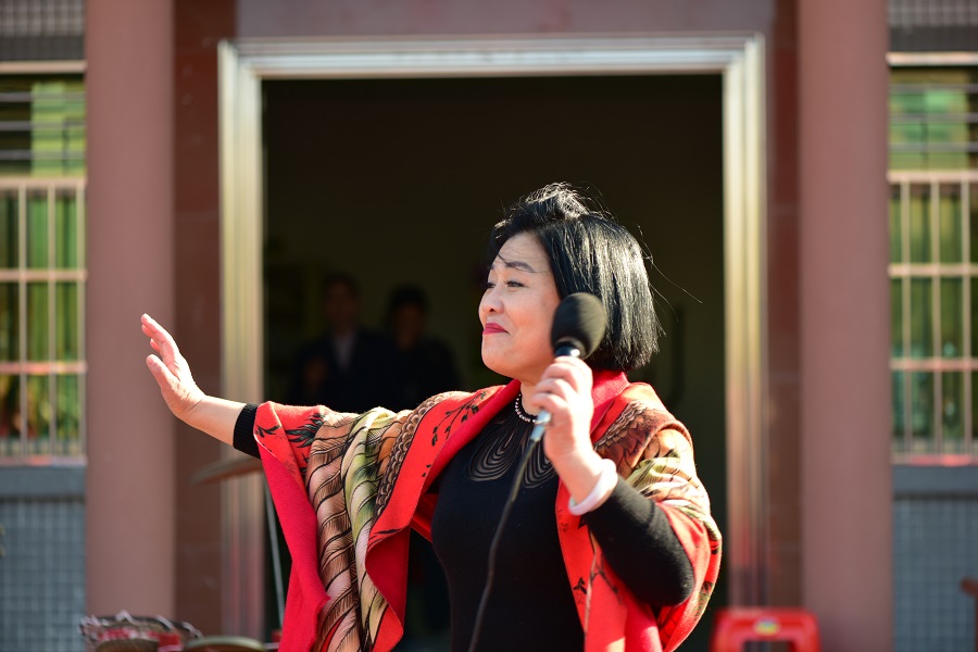 “賣菜大媽”張學(xué)敏,1963年生人,河北唐山一名地地道道以種地賣菜為生的農(nóng)民。因天生一副好嗓子參加《星光大道》而被觀眾親切地稱為“賣菜大媽”,在2013年春節(jié)聯(lián)歡晚會(huì)上,以技驚四座的海豚音和一曲《春天的芭蕾》深受廣大觀眾的喜愛(ài)。宣講會(huì)上賣菜大姐張學(xué)敏演出 (1)
